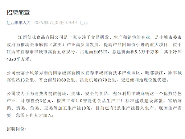江西創(chuàng)味食品有限公司是一家專注于食品研發(fā)、生產(chǎn)和銷售的企業(yè),是豐城市委市政府為推動全市麻鴨(禽類)產(chǎn)業(yè)高質(zhì)量發(fā)展,提高產(chǎn)品附加值引進的重大項目,位于江西省宜春市豐城市高新五路18號,占地面積65畝,總建筑面積5.3萬平方米,其中冷庫4320平方米。公司坐落于風...